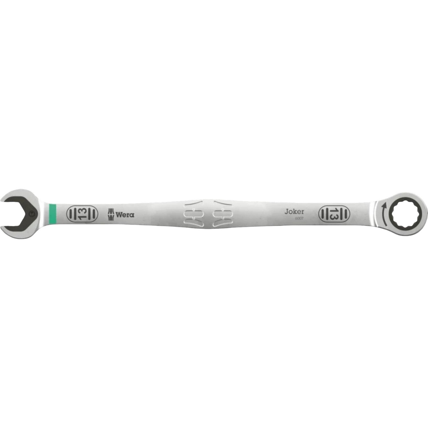 Unique combination of jaw and ring ratchet mechanism in a long design. For hexagon screw heads and bolts. The long lever allows for higher power transmission. The long design also improves accessibility at low-lying couplings. With holding function enabled by a metal plate in the mouth, which reduces the risk of losing screws and sockets. With its extra hard teeth, the exchangeable metal plate in the mouth secures screws and sockets and reduces the risk of slipping. The integrated end stop can prevent the screw head from slipping down and allows application of high torques. The double hexagon geometry ensures a positive connection with the screw or bolt and thus reduces the risk of slipping. A return angle of only 30° at the jaw end avoids time-consuming rotating of the tool whilst screwdriving. Ratchet mechanism at the ring side with exceptionally high fine toothing of 80 teeth for flexibility even in confined spaces. The specially engineered geometry allows high torque transmission and high bending stiffness. Made of high-performance chromium molybdenum steel with nickel-chromium coating for high corrosion protection. With Take it easy tool finder: colour coding by size and extra laser-engraved size indication.Wera 05020359001 6007 Joker Sb Ring Ratchet Spanner, Long Design, 16 X 304.5 Mm
