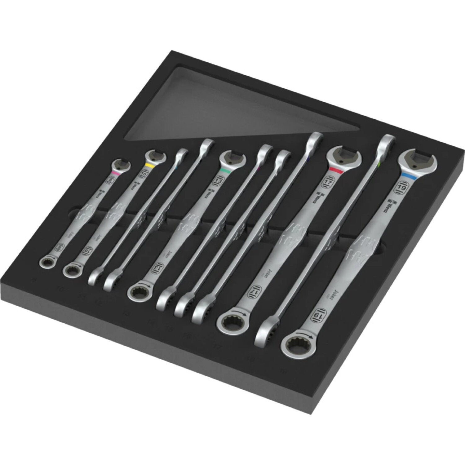 Durable foam insert; two-coloured for quick identification of missing parts; suitable for the Tool Rebel roller cabinets. Equipped with 11 long 6007 Joker ratcheting combination wrenches.The long lever allows for higher power transmission and better accessibility at low-lying couplings