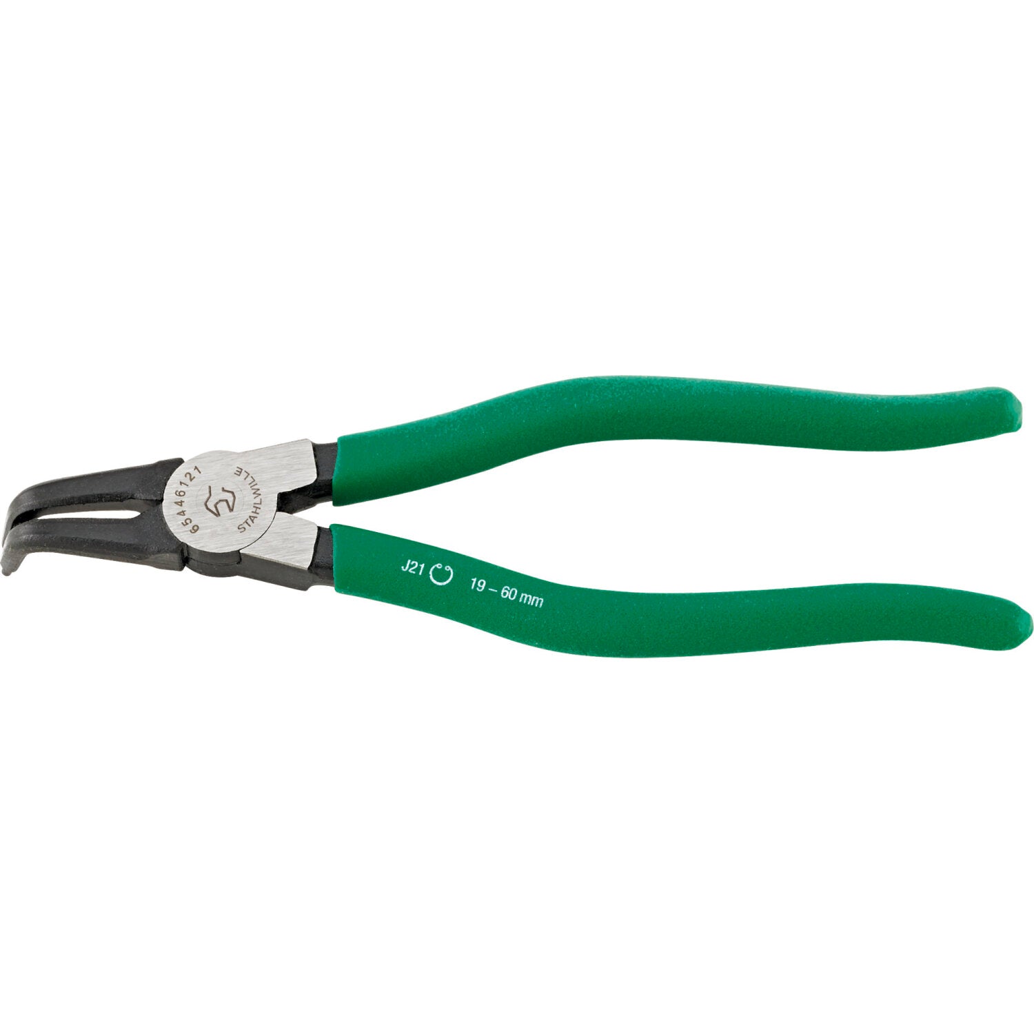 Slim-profile circlip pliers for working in tight spaces, with angled jaws for easy access to hard-to-reach components. Precision tips ensure an optimal fit in circlip mounting holes, while textured, anti-slip handles provide secure control. The handle is marked with circlip type and diameter on top and the EAN code on the inside.