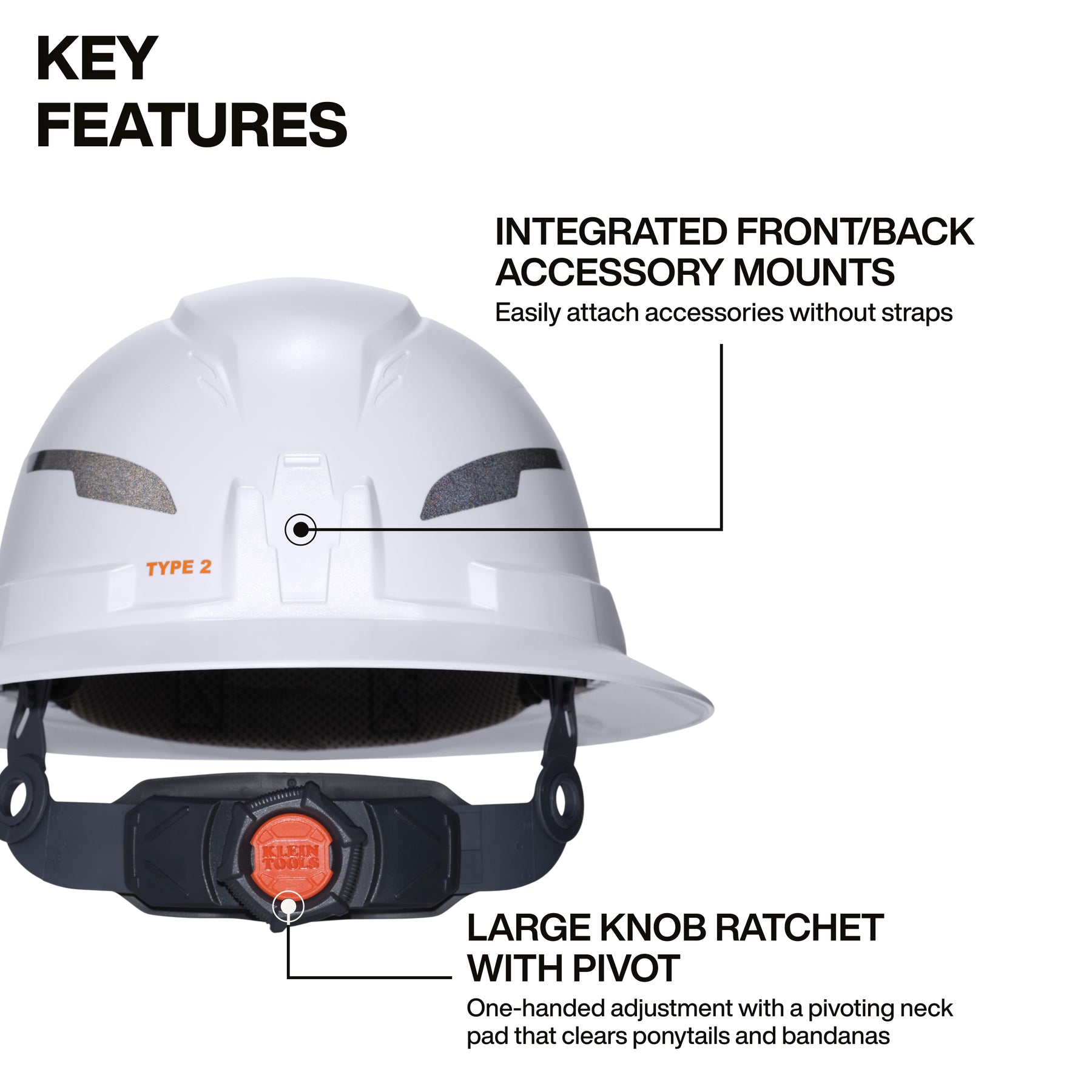 Klein Tools Cat. No. 60406T2RL Type 2 Hard Hat delivers advanced protection, comfort, and visibility for demanding jobsite conditions. Patented accessory mounts allow secure, strap-free headlamp attachment—paired with an included 300-Lumen rechargeable headlamp for all-day runtime. The 6-Point suspension system ensures a comfortable, breathable fit, while washable padding and a non-vented full brim shell provide reliable performance in high-risk environments.Klein Tools 60406T2RL Type-2 Hard Hat, Non-Vented Full Brim with Rechargeable Headlamp, White