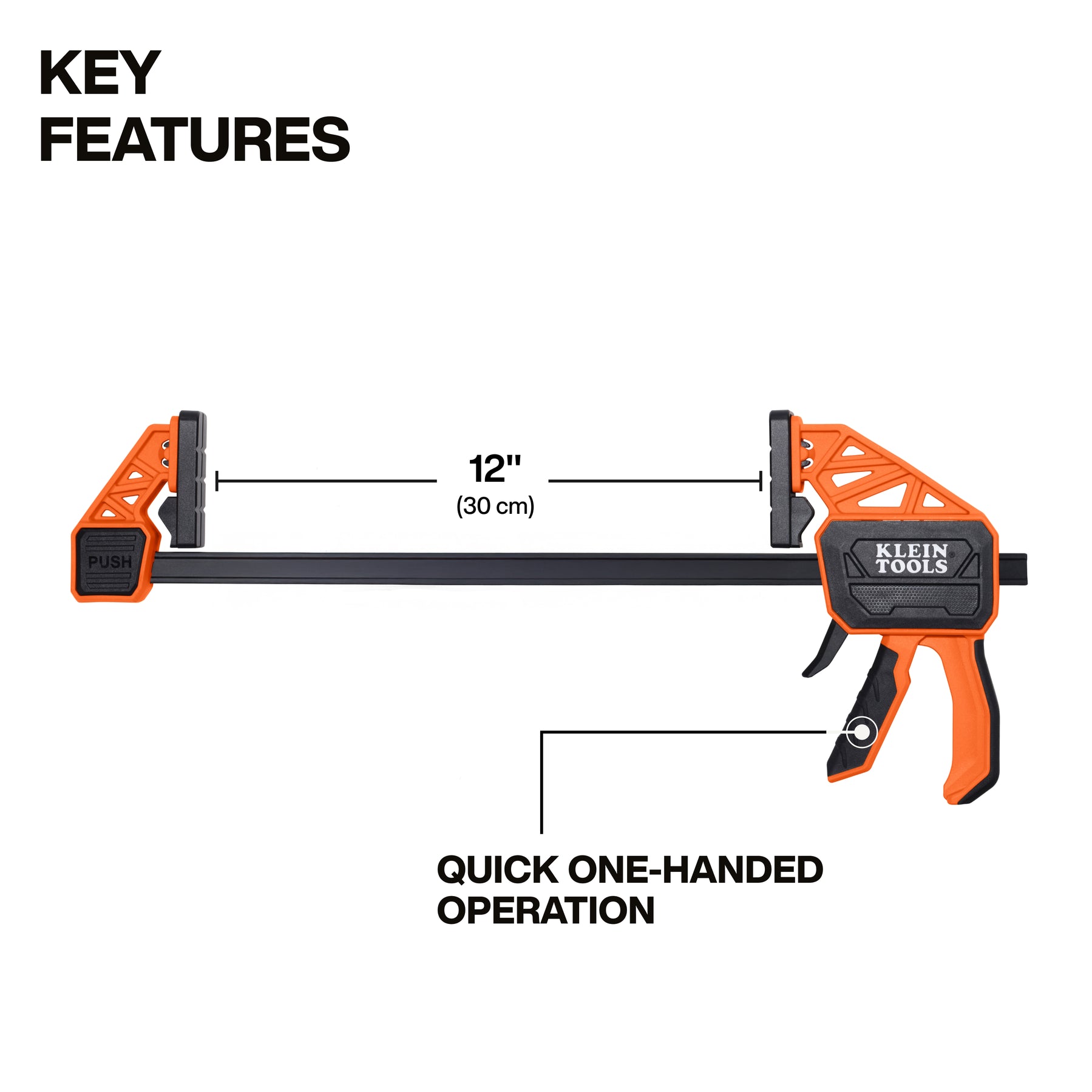 Klein Tools Speed-Klamp12-Inch clamp delivers quick one-handed operation with 300-Pound clamping force. Pads pivot and detach to accommodate various surfaces, ensuring a secure grip. Dual-purpose functionality converts the clamp into a spreader for expanded use across woodworking and metalworking applications.Jaw Pad Style: Rubber