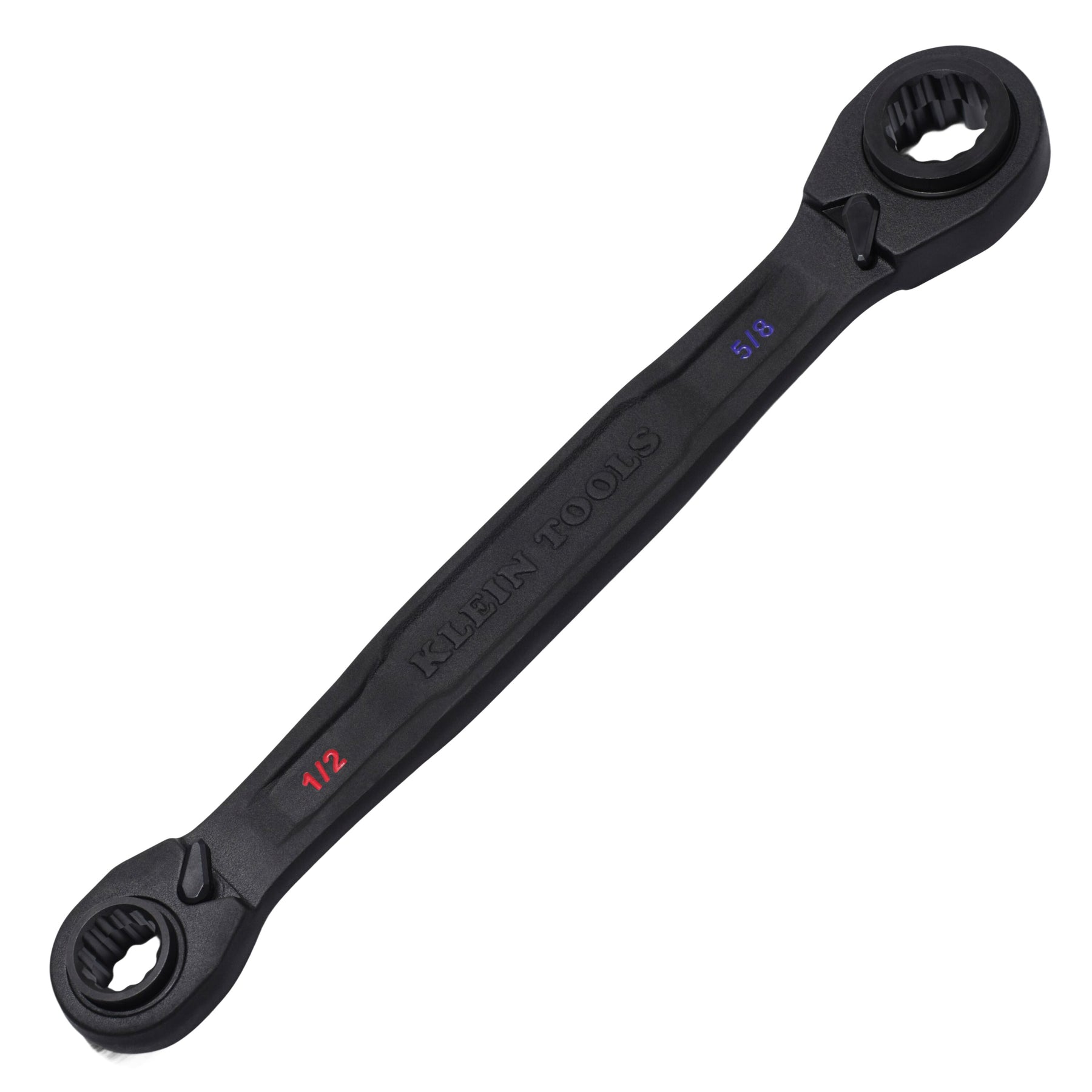 Klein Tools 4-in-1 Ratcheting Wrench combines four SAE hex sizes (1/2, 9/16, 5/8, 3/4-Inch) in one versatile tool. Features 90-tooth ratchet mechanism to minimize arc swing for access in tight spaces and a pass-through design accommodates longer threads. The reversing switches enable quick direction changes and an ergonomic handle provides optimized comfort during extended use or repetitive tasks.