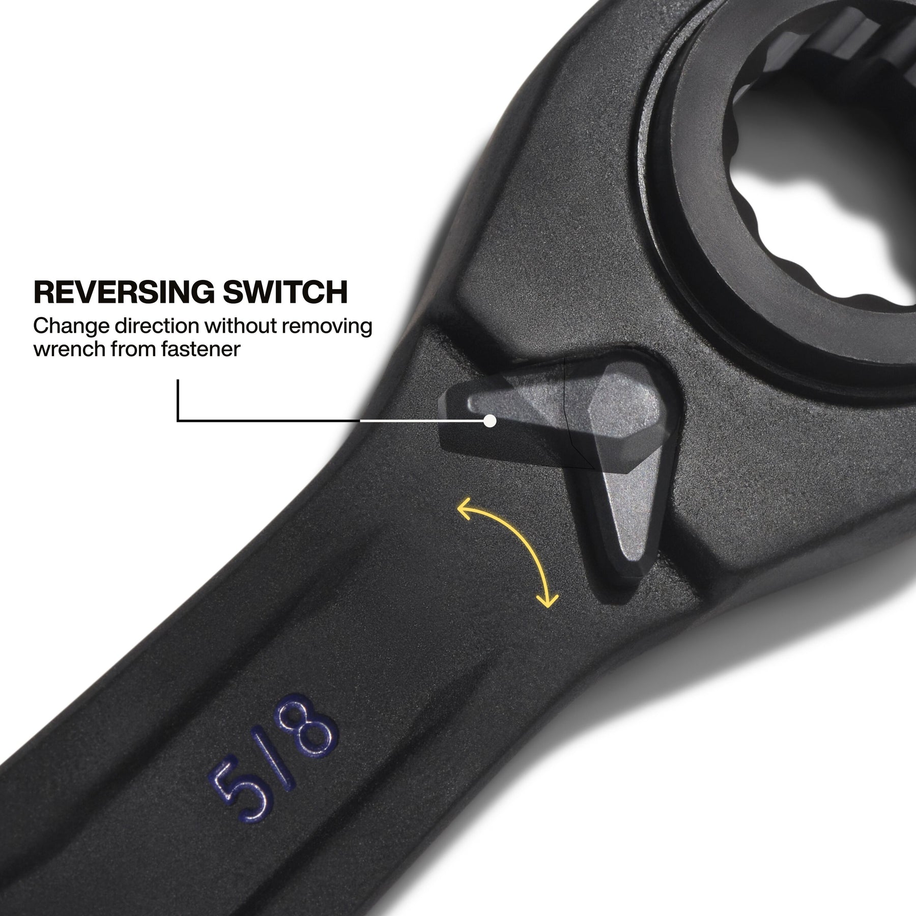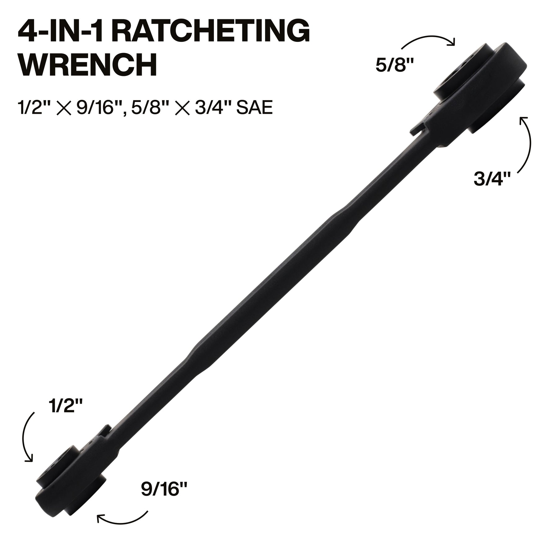 • 4-in-1 ratcheting wrench includes 12 point hex sizes 1/2, 9/16, 5/8, and 3/4-Inch SAE for versatile applications