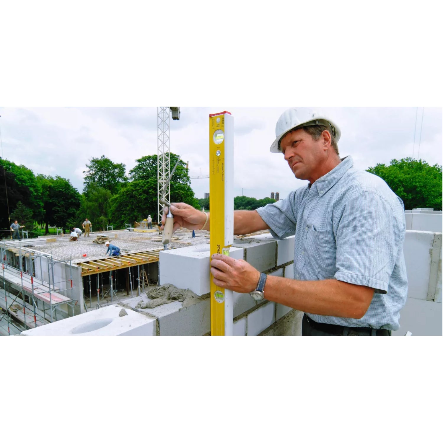 This series of levels has been engineered for contractors that work with brick and block and prefer to touch or hit the level with their trowel etc. Through the two strike zones, any out-of-line bricks can be adjusted with taps of a trowel. Added to this the hand grips on the 36in and 48in lengths make for easy handling. The tough reinforced aluminum frame precisely aligned with the STABILA locked vial system is the guarantee for accuracy on any harsh building site.Large hand grips on 36in and 48in lengths.