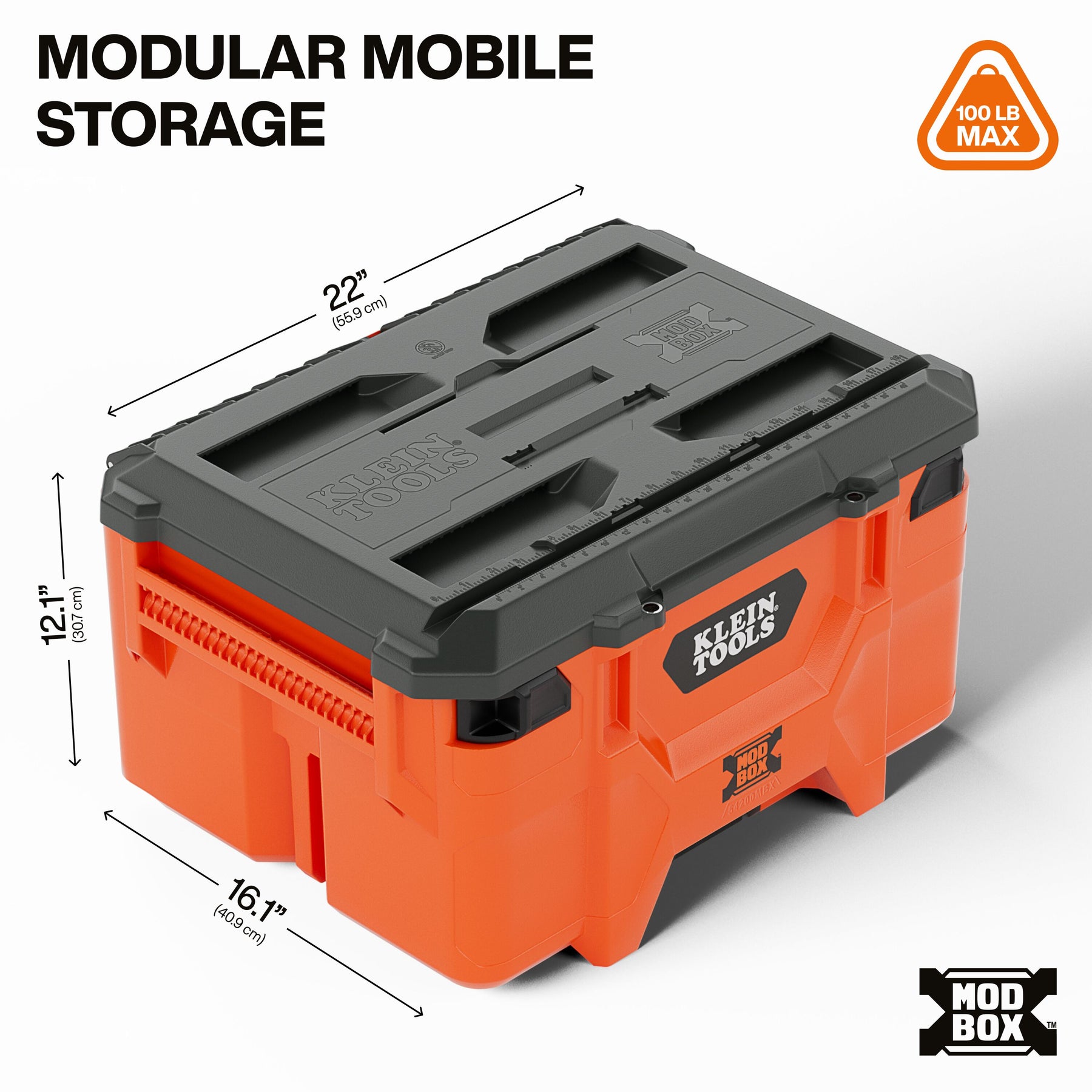 The Klein Tools MODbox Medium Toolbox delivers versatile mid-size storage with a 100-Pound capacity and a removable tool caddy for quick access. The case-compatible lid includes a V-groove and molded ruler, while IP65-rated polymers protect tools from dust and water. Connects effortlessly with all MODbox components for a customized mobile workstation.