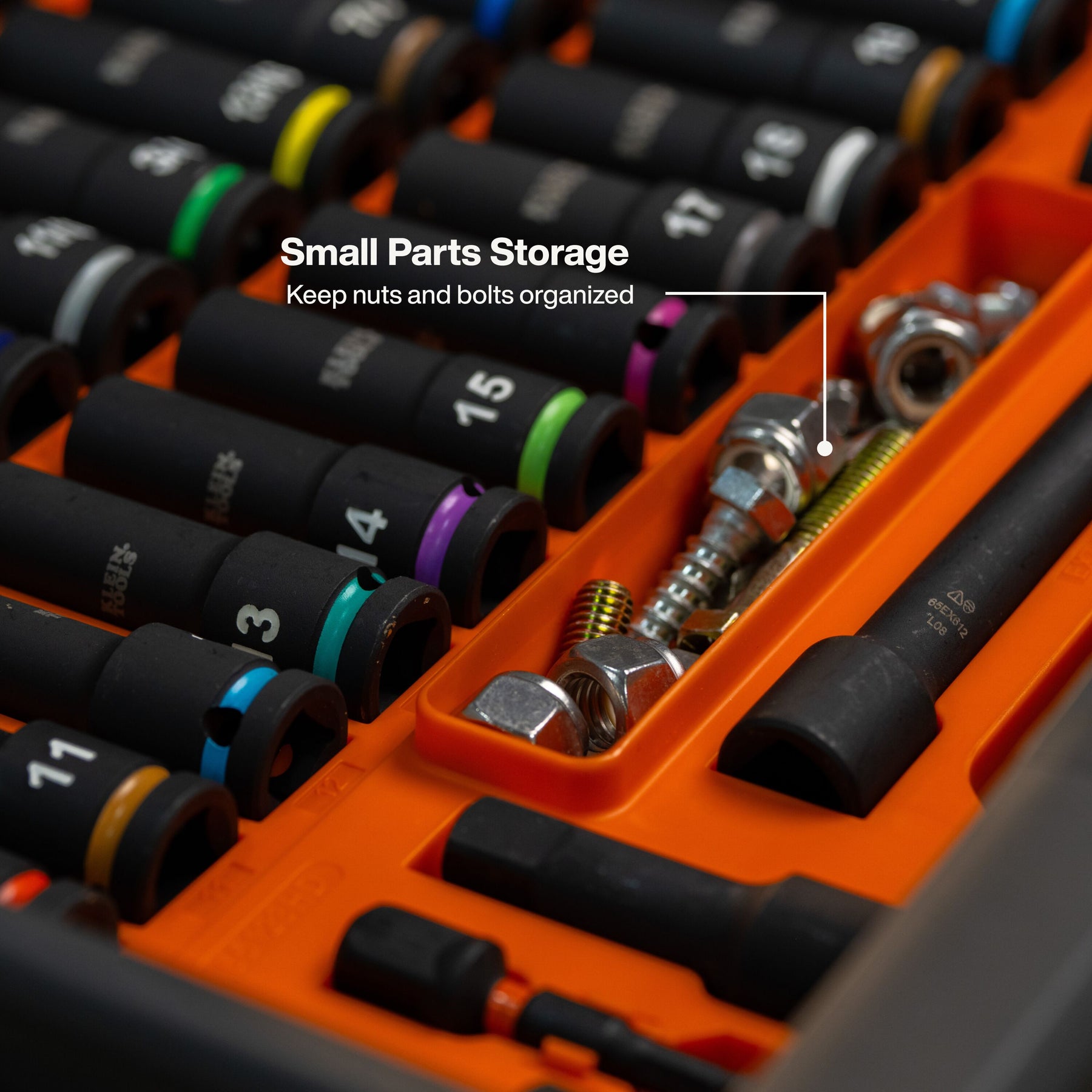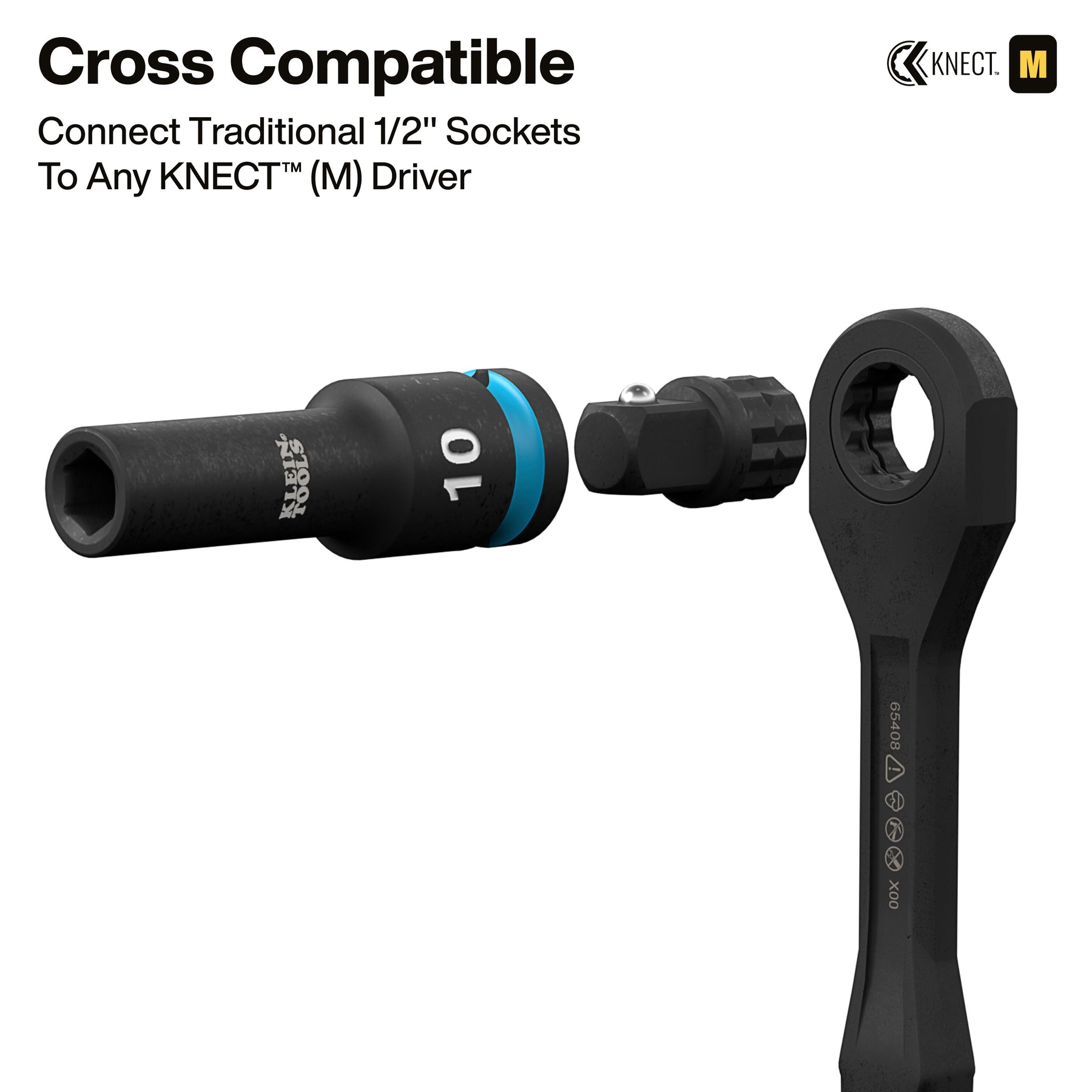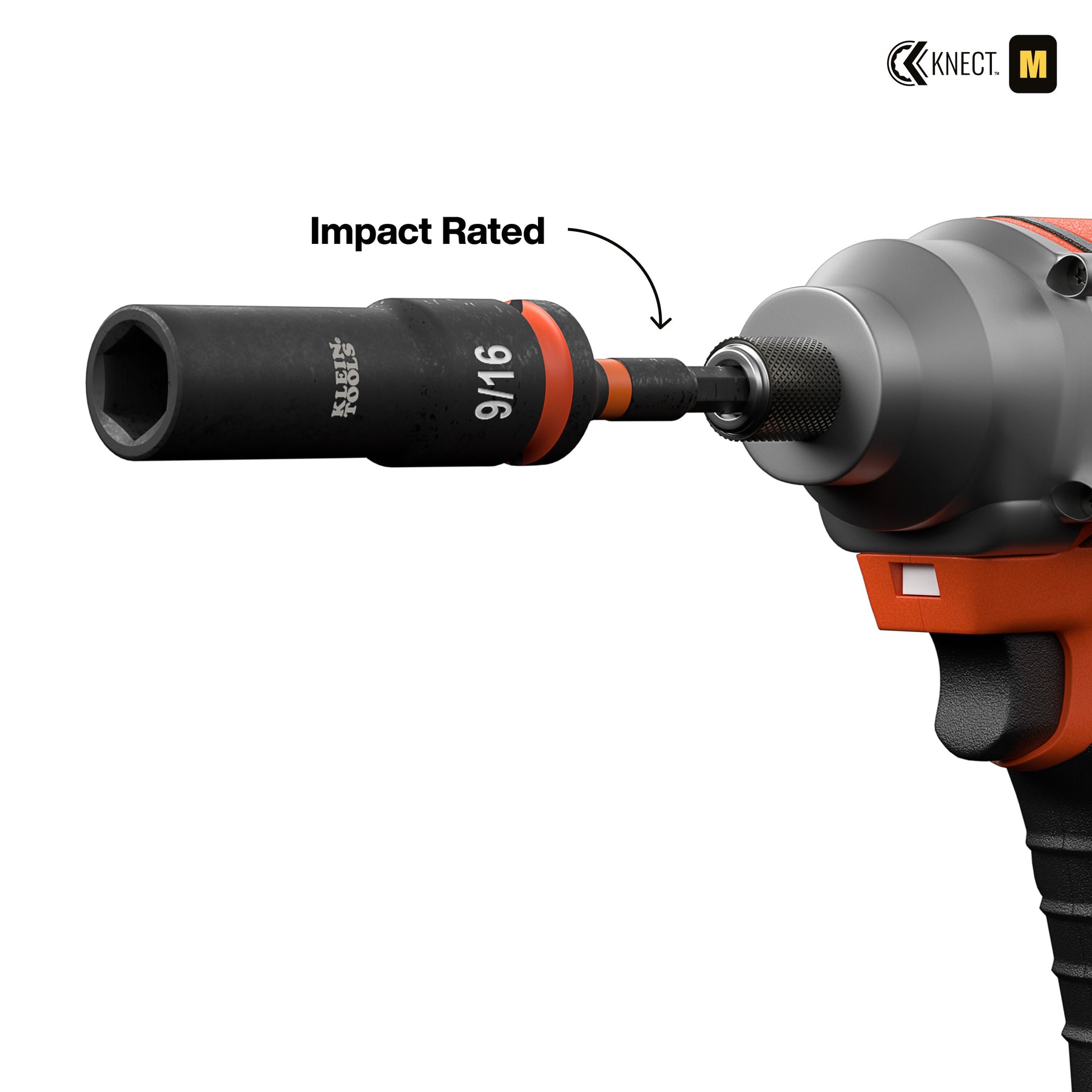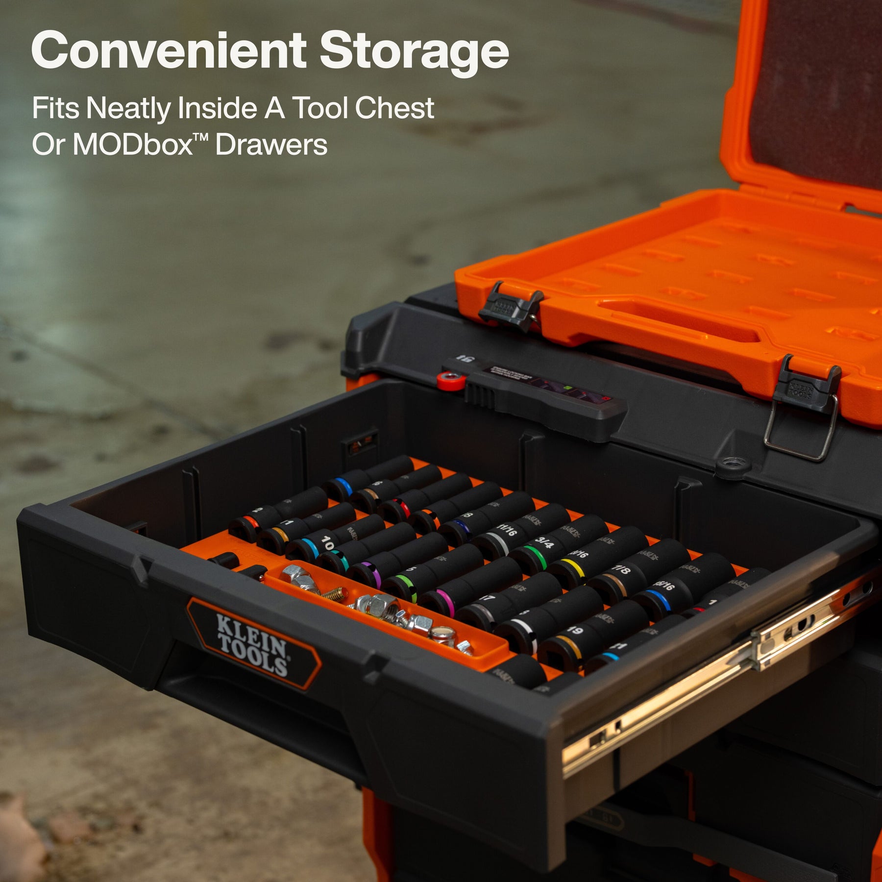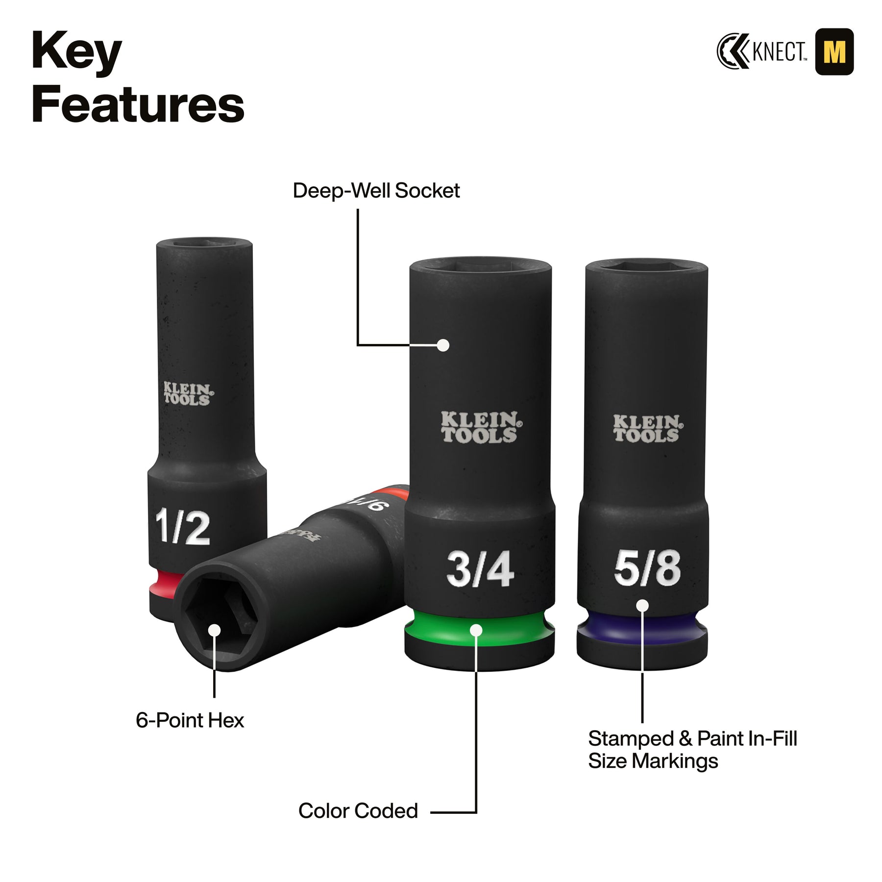Professional-grade 28-Piece deep-well socket set combines SAE and metric sizes for complete versatility. Engineered with optimized wall thickness to maximize access while maintaining high torque performance. Heat-treated Cr-Mo steel construction delivers impact-rated durability. Complete with multiple adapters, 3-Inch and 6-Inch extensions, plus organized blow-molded case with small parts storage for maximum efficiency and organization.Klein Tools 65123HD KNECT 1/2" Deep-Well Impact Socket Set, SAE / Metric, 28 Pc.