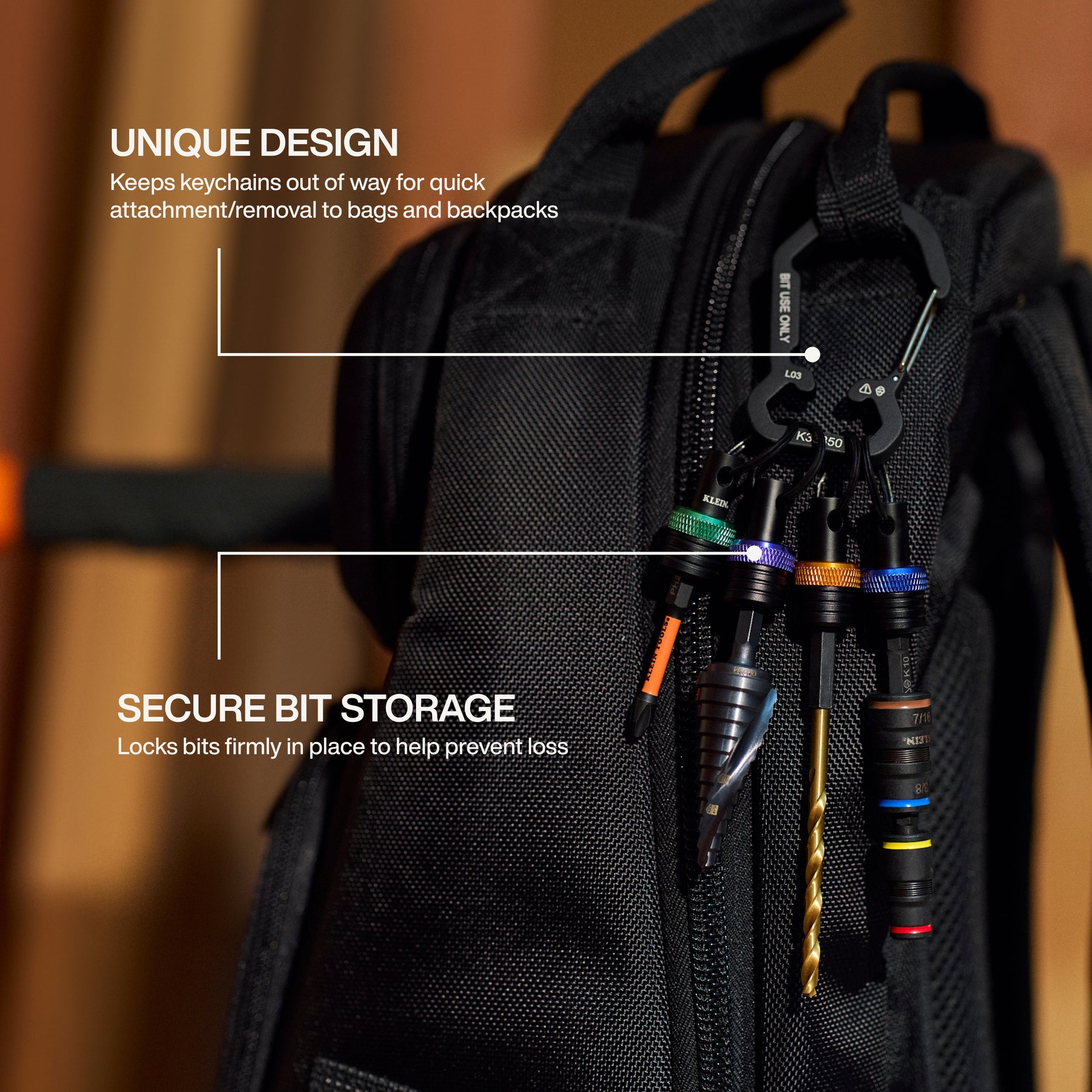 Klein Tools Bit Holder Keychain Set keeps 1/4-Inch hex bits securely stored and easily accessible. Each bit holder features colored bands for fast identification, and the durable keychain clips easily to belts, tool pouches, and bags. Individual holders keep bits separated for fast selection and increased efficiency on the job.