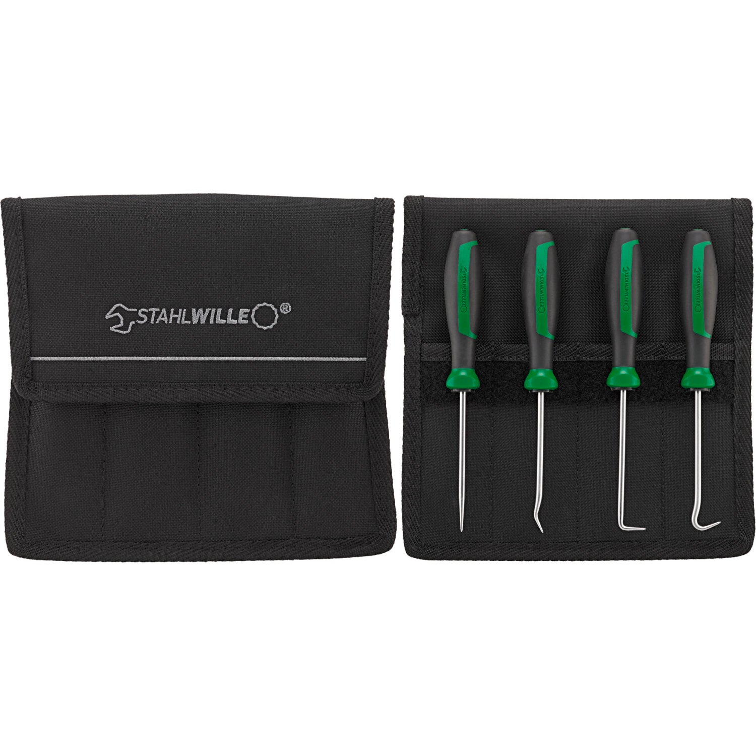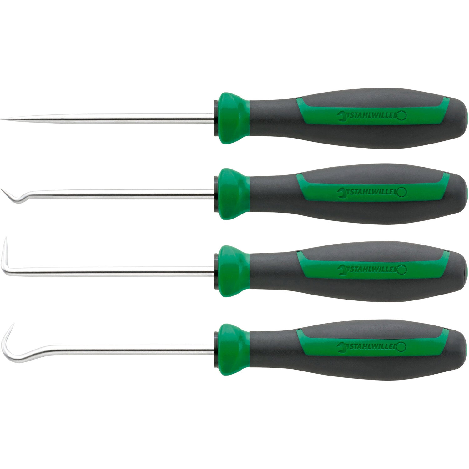 - 4-piece hook tool set for punching soft materials when assembling/disassembling small parts such as O-rings, seals or trims.
