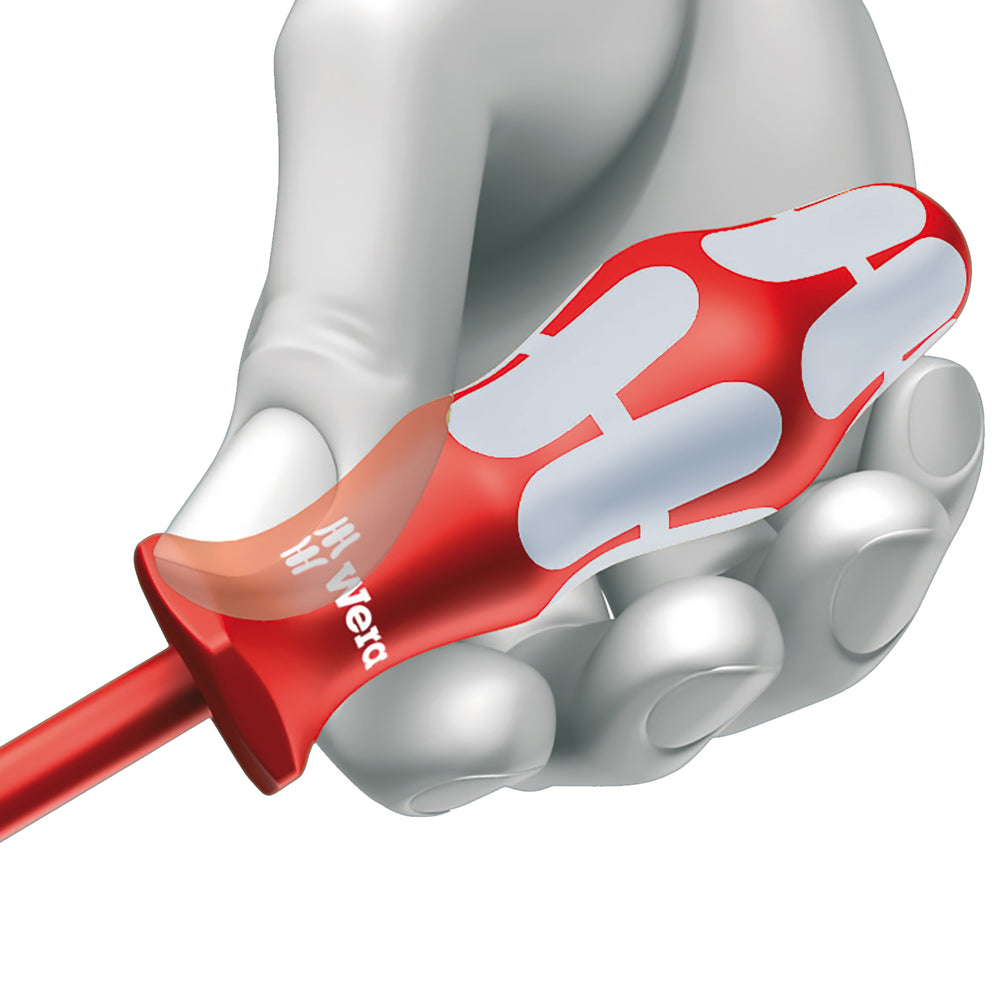 High quality Kraftform Plus screwdriver out of stainless steel. The stainless tools from Wera are vacuum ice-hardened and have the hardness and strength needed for screw connections. They can be used for industrial application without hesitation. Multi-component Kraftform handle for fast and low-fatigue working. "Take it easy" Tool Finder: colour coding according to profile and size. The hexagonal anti-roll feature prevents any bothersome rolling away at the workplace.Wera 3335 Screwdriver for slotted screws, stainless, 0.5 x 3 x 80 mm