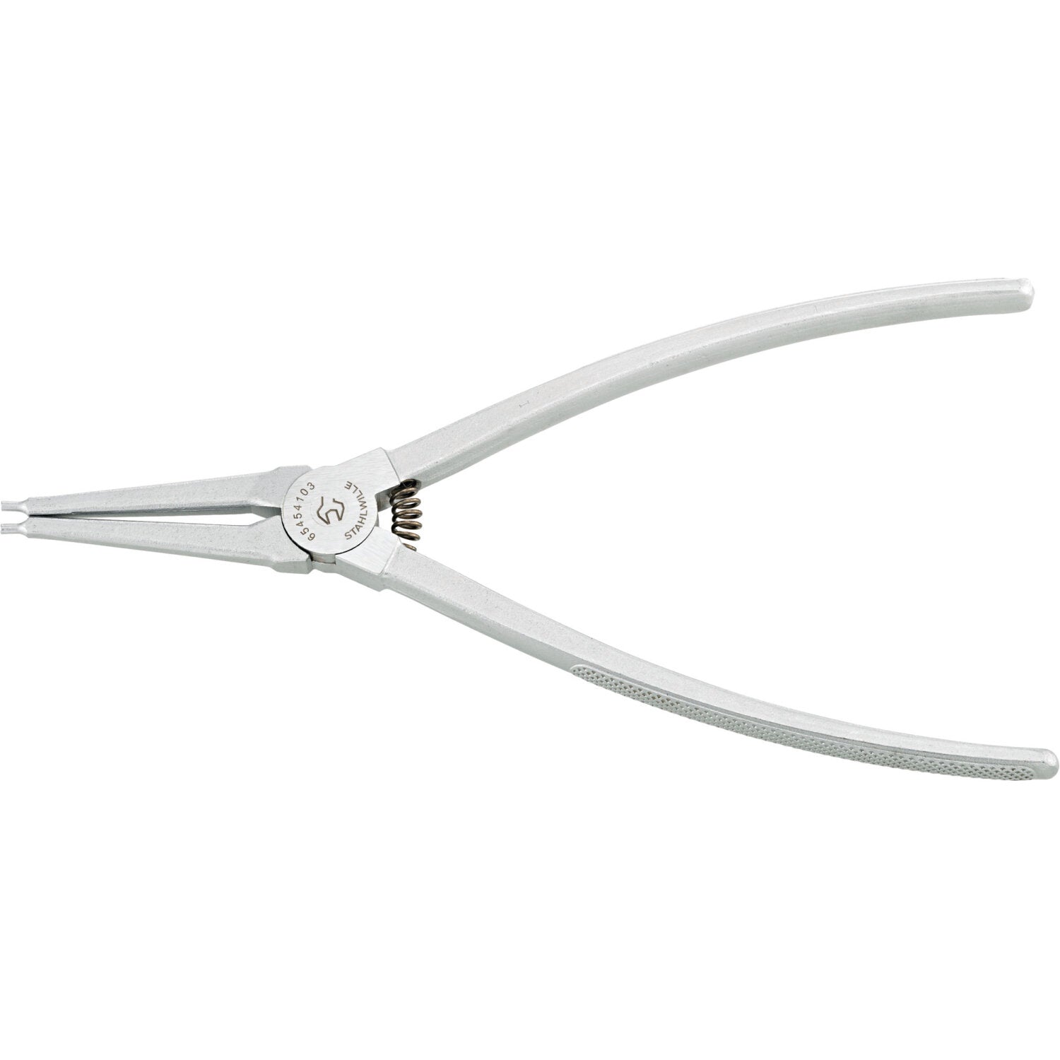Slim-profile circlip pliers with precision cylindrical tips for an exact fit in circlip holes, featuring chequered handles for a comfortable grip and easy use in tight spaces.