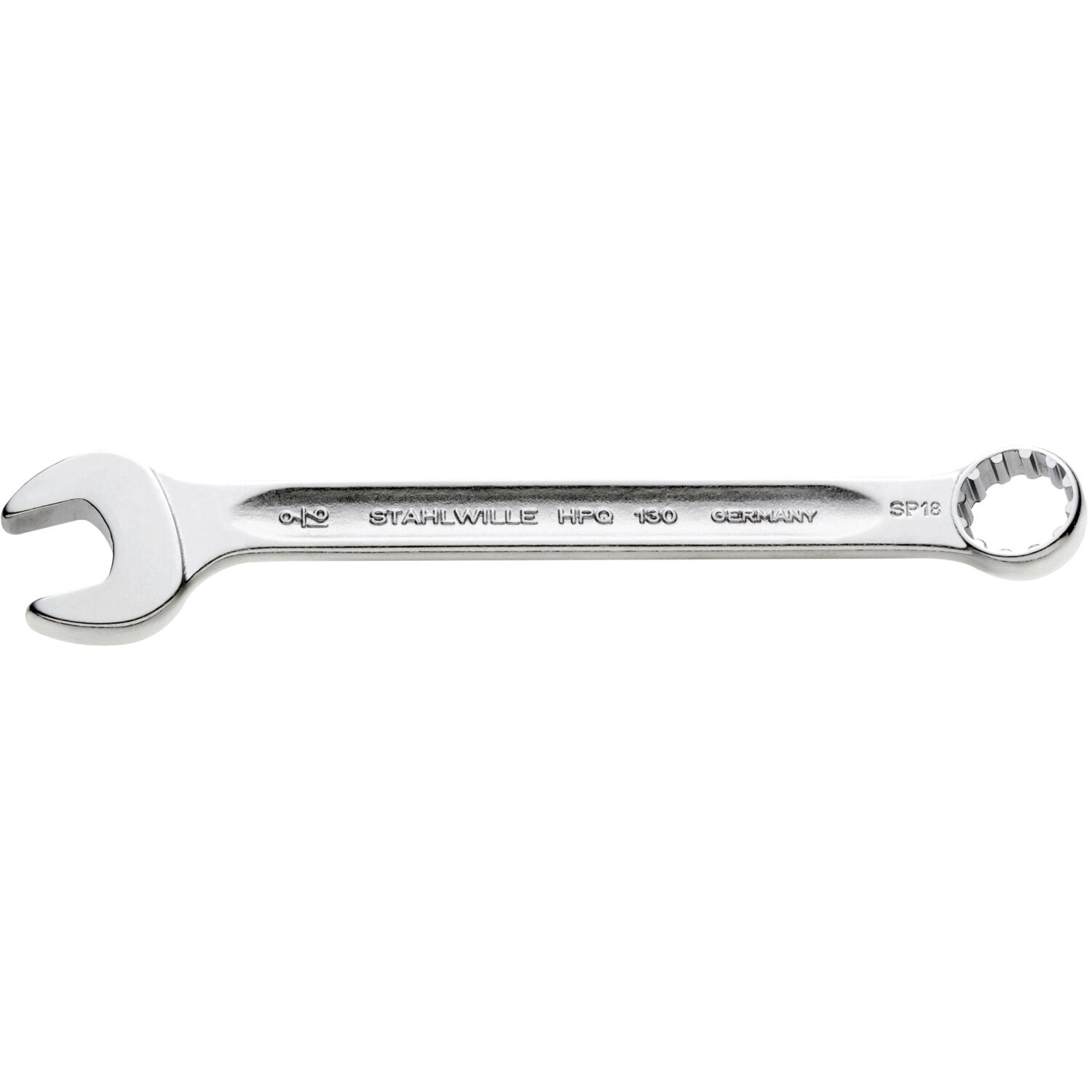 Made in Germany, the 130aSP Spline Drive Spanner from STAHLWILLE is an imperial combination wrench with a Spline-Drive, spline size 16 (1/2"), a jaw side angled at 15°, and a length of 150 mm. It is manufactured from HPQ® high performance steel (40583232). A special manufacturing process allows thin-walled rings, making it ideal for working in hard-to-reach places. The Spline-Drive profile reduces the risk of edge damage by distributing force evenly across the flanks of the bolt or nut. The double-T profile provides outstanding flexural strength, while the distinctive STAHLWILLE rounded finish ensures the wrench is comfortable to hold and easy to grip, allowing safe working even with oily hands.