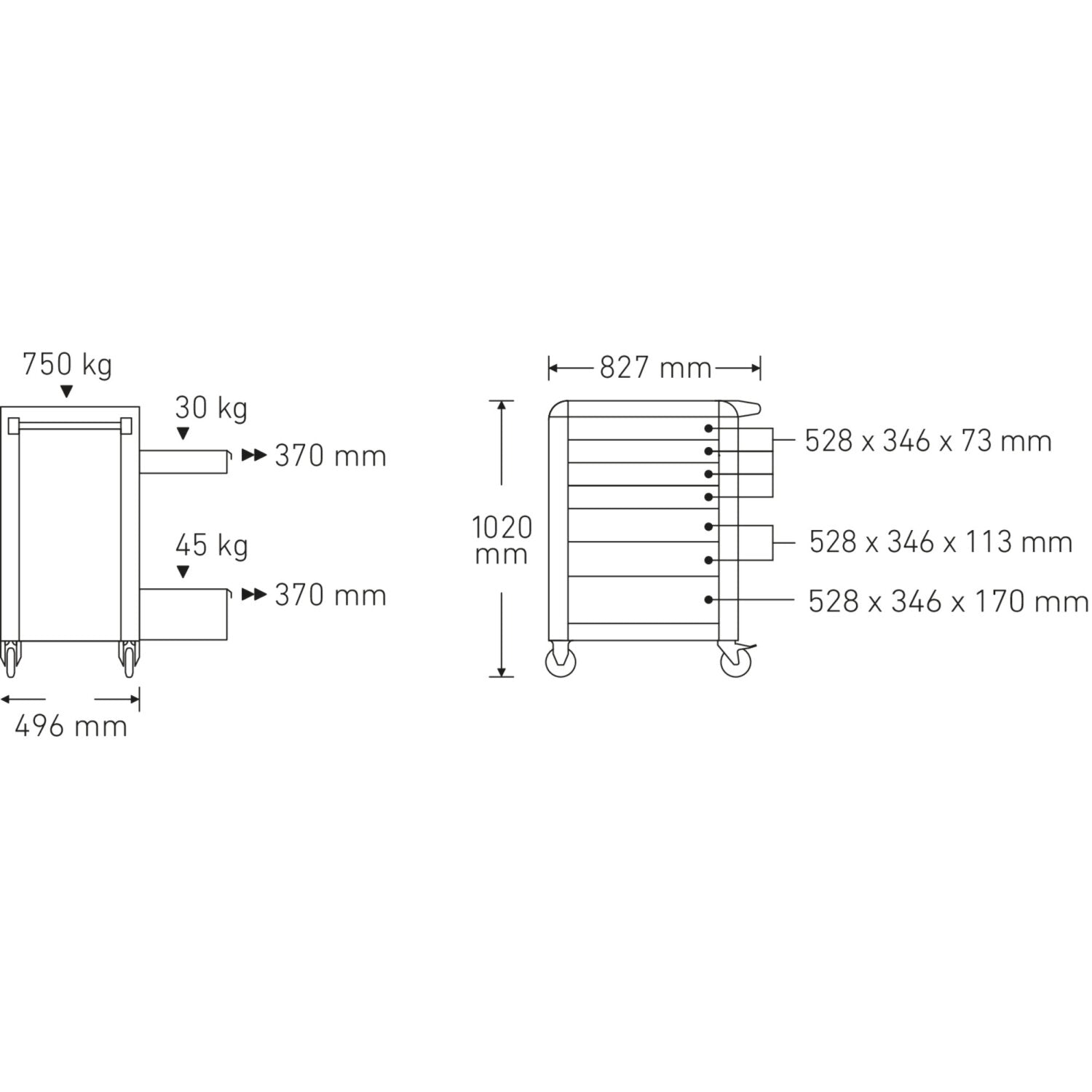 • The all-round bumper with impact damping effectively protects the workshop trolley and its surroundings from damage in the event of collisions.