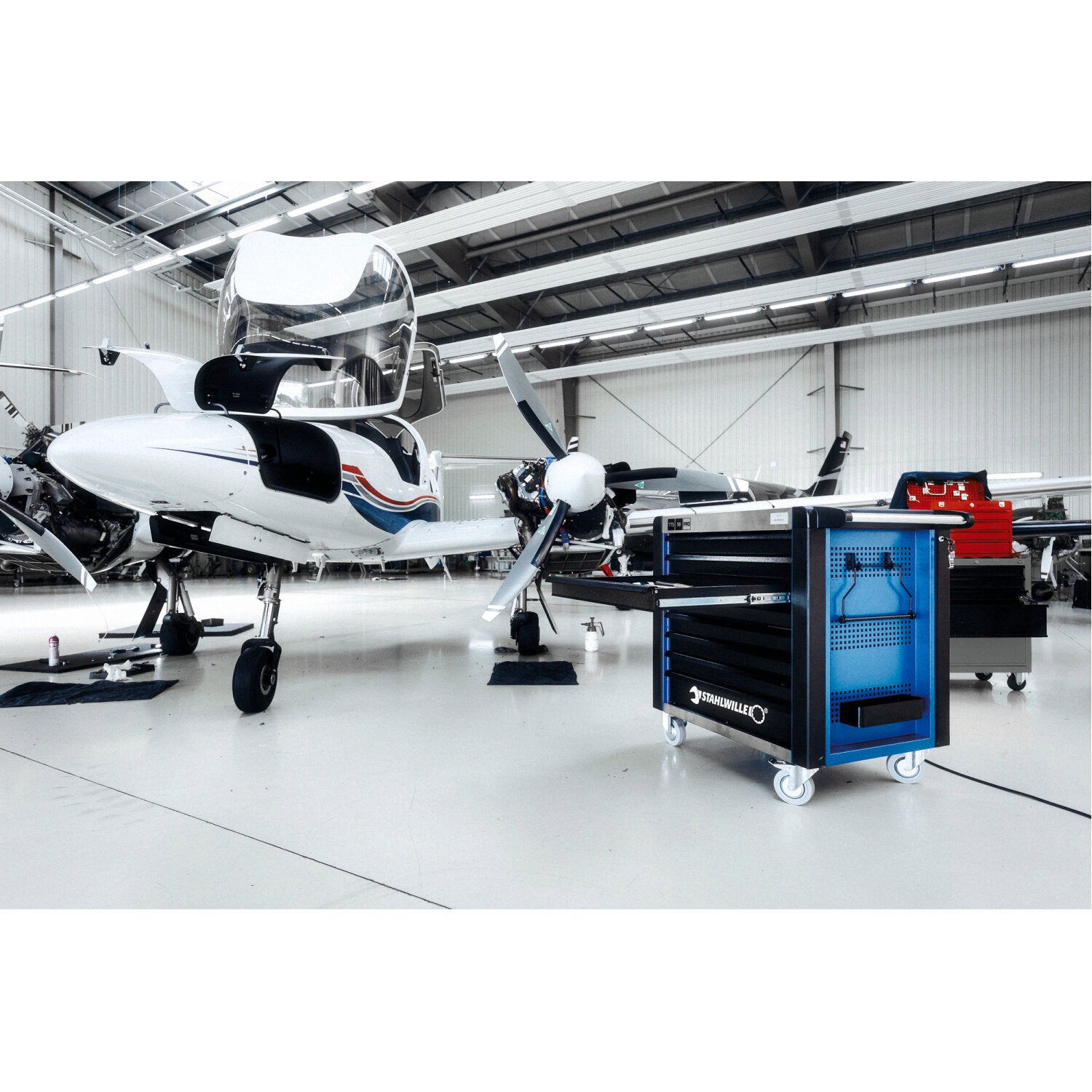 This tool trolley offers maximum storage area with a width of 100 cm, a depth of 65 cm, and full drawer extension for convenient access It is constructed from high-quality, durable materials, including a tightly welded stainless steel top tray. The trolley is available with 7 or 8 easily removable drawers to suit different storage requirements Oil- and acid-resistant smooth-running castors (Ø 125 mm) with thread protection and two locking brakes ensure reliable mobility and stability. The design provides a high static load-bearing capacity of up to 1,400 kg.High quality, durable materials such as tightly welded stainless steel top tray.