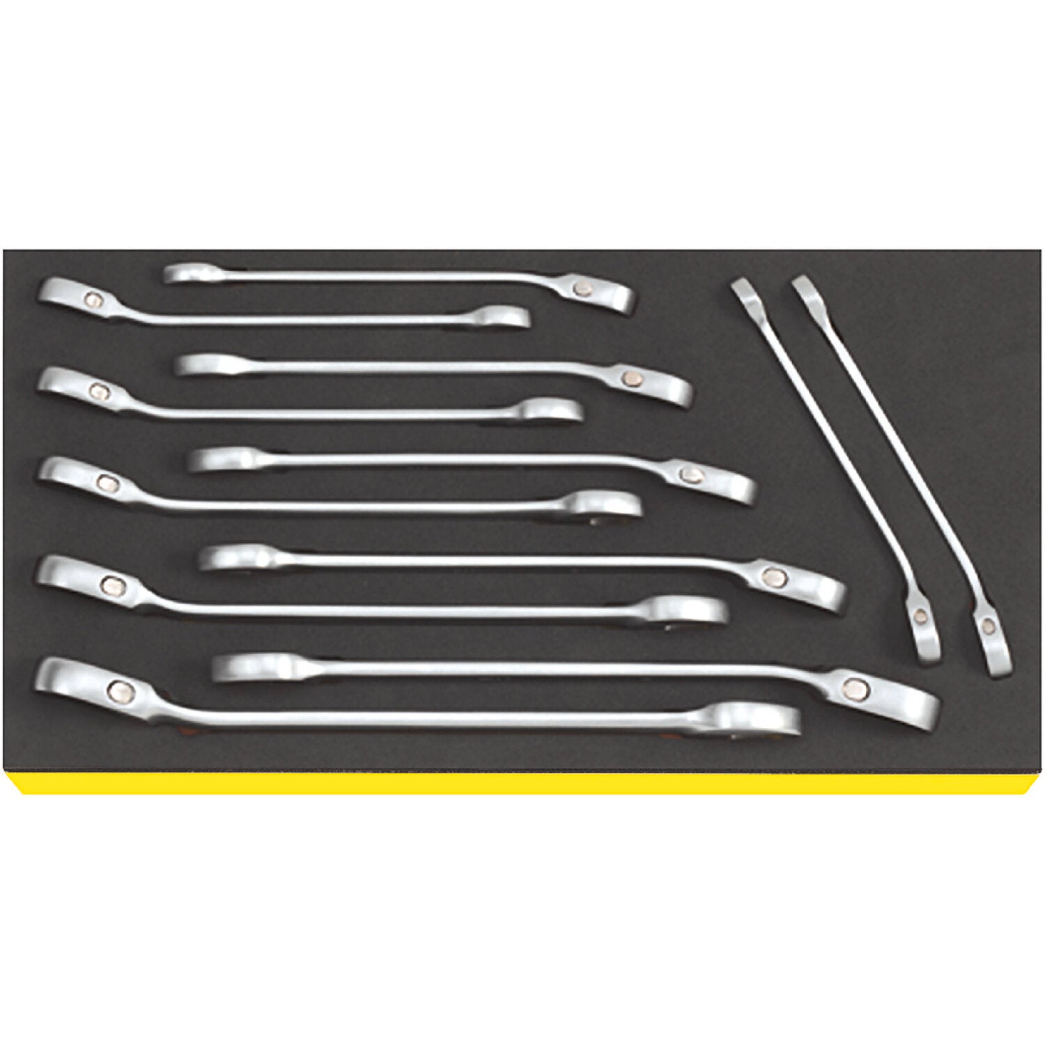- High-quality combination ratcheting wrench set in metric sizes.