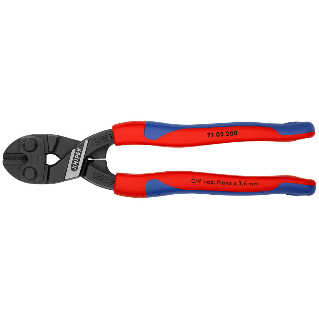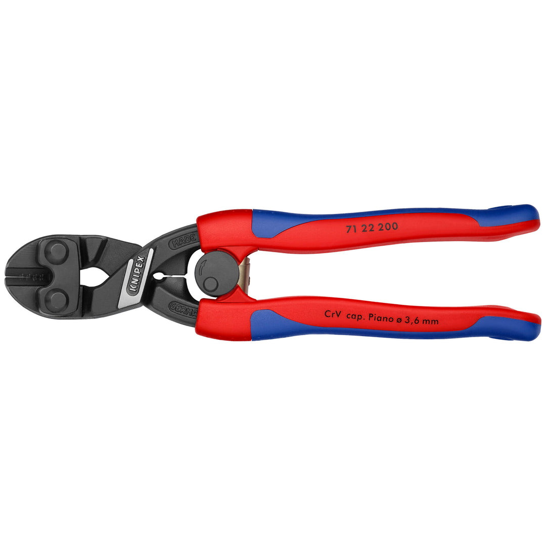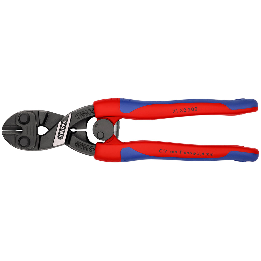 Exceptional cutting performance: 60% less effort compared to conventional high leverage diagonal cutters. Induction hardened cutting edges (approx. 64 HRC) for cutting soft, hard and piano wire. Cuts materials like bolts, nails, rivets, etc. up to 1/4" (6.0 mm) diameter. Exceptional cutting performance with minimum effort because of lever action design. Micro-structured cutting edges allow easy cutting of large cross-sections. Gripping surface below the joint for gripping and pulling wires with a diameter from 3/64". 20˚ angled head with single-sided joint bar and diagonal cutting edge for flush cutting; with space for gripping. Straight blade. Opening spring and locking device are integrated in the handles for comfortable work and protected transport. Pliers with integrated tether attachment point for tool drop protection system. Chrome vanadium heavy-duty steel; forged, multi stage oil-hardened.Knipex 71 22 200 T BKA 8" CoBolt® High Leverage 20° Angled Compact Bolt Cutters-Tethered Attachment