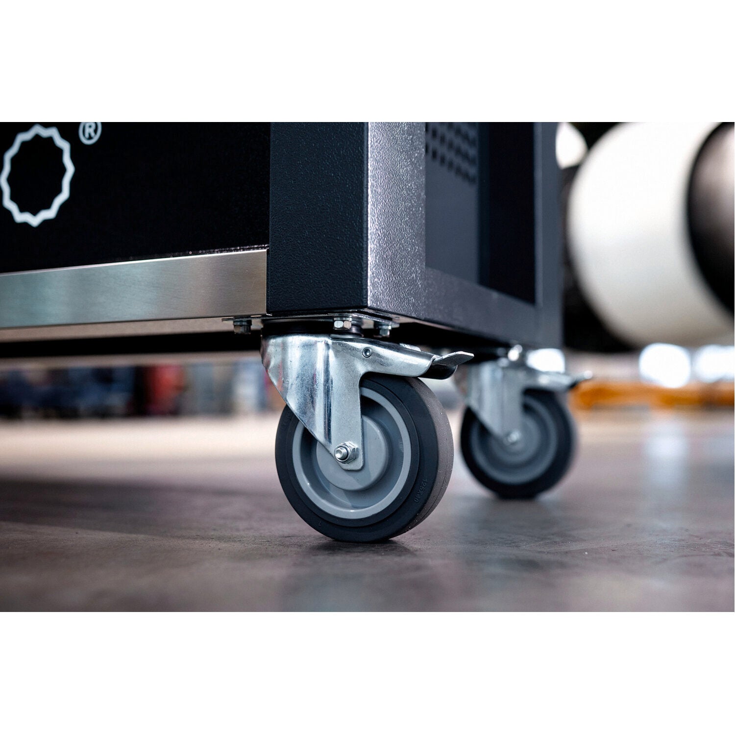 Oil and acid resistant wheels (Ø125 mm) with thread protection and with two locking brakes
