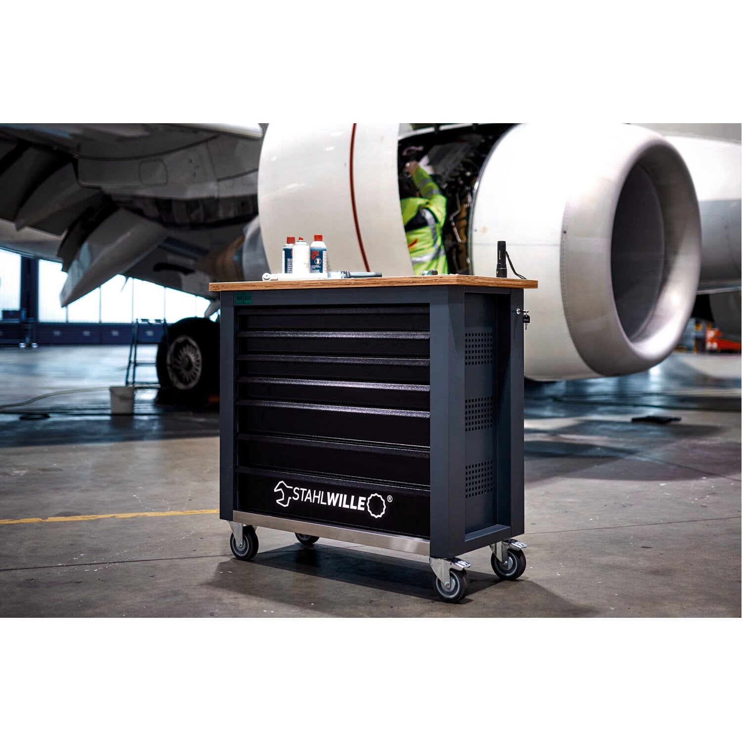 WB 625 with 7 fully extendable drawers and large birch multiplex worktop with a working height of 104 cm.