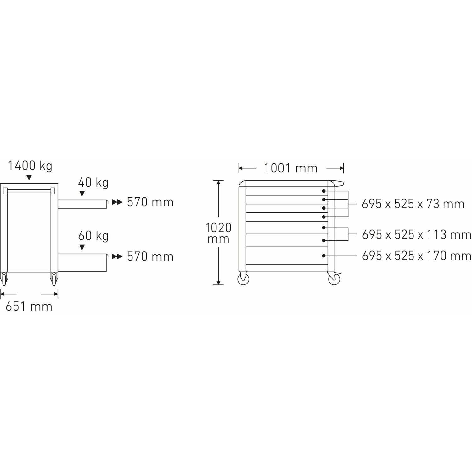 This tool trolley offers maximum storage area with a width of 100 cm, a depth of 65 cm, and full drawer extension for easy access to all contents It is built from high-quality, durable materials, including a tightly welded stainless steel top tray. The trolley features 7 easily removable drawers for structured and convenient storage Oil- and acid-resistant smooth-running castors (Ø 125 mm) with thread protection and 2 locking brakes provide reliable mobility and stability. The sturdy construction ensures a high static load-bearing capacity of up to 1,400 kg.High quality, durable materials such as tightly welded stainless steel top tray.