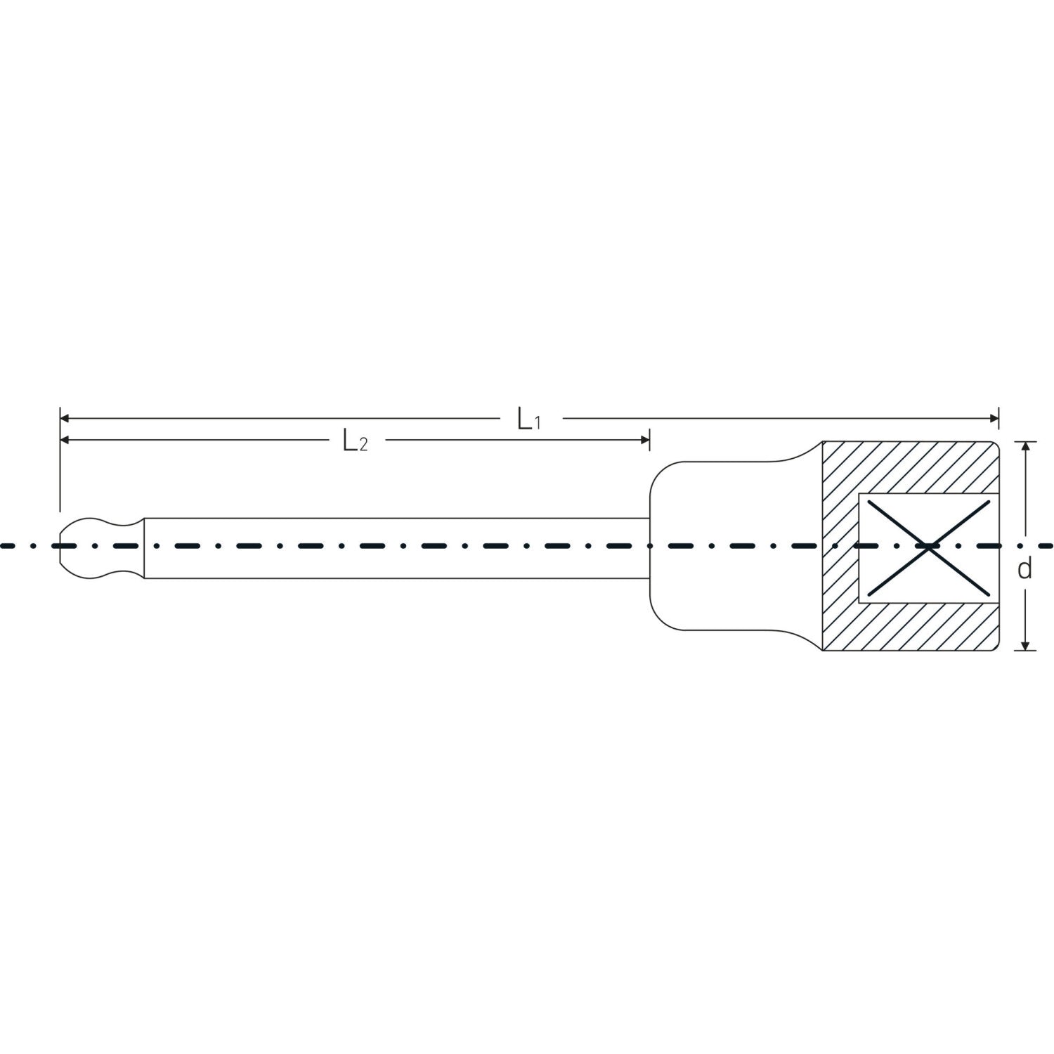 This ball-ended tool is designed for hex socket head screws and features a 1/2" internal square drive for secure connection. It allows a swivel angle of up to 25° to each side, enabling flexible operation. Manufactured from Chrome Alloy Steel and chrome-plated, it ensures strength and durability.