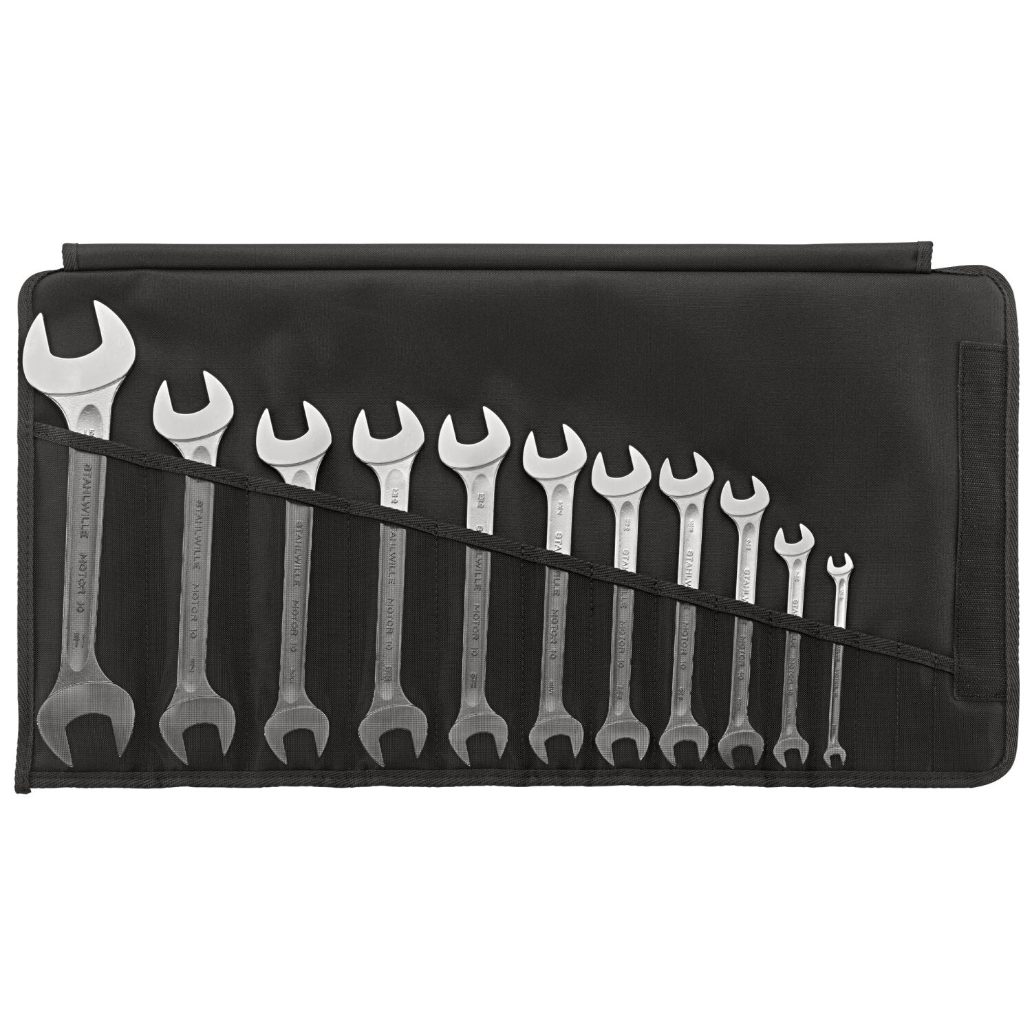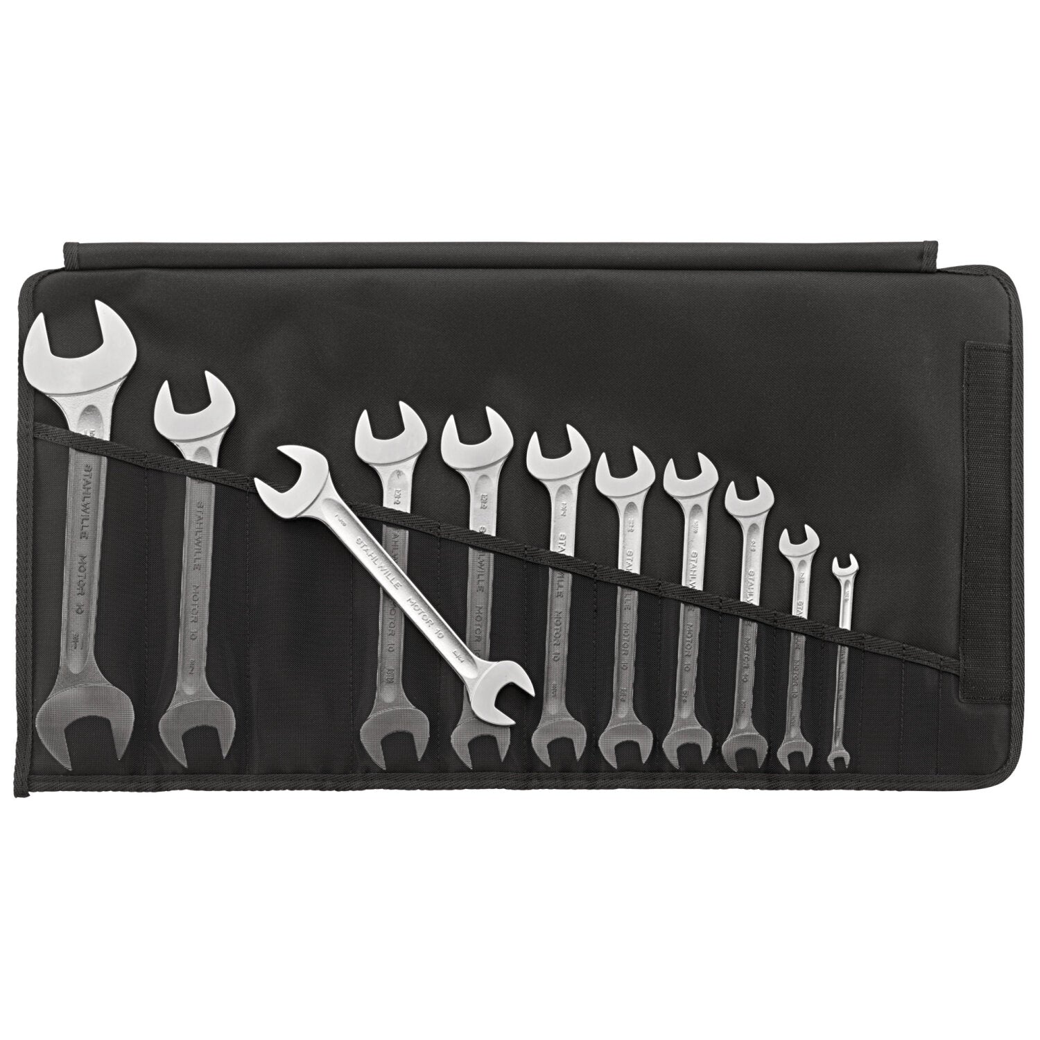 Made in Germany - STAHLWILLE double open-ended wrench set in sturdy roll-up bag, 11 , , jaw 15° angle, DIN 3113 Form A, chrome alloy steel, chrome-plated, 96404307.